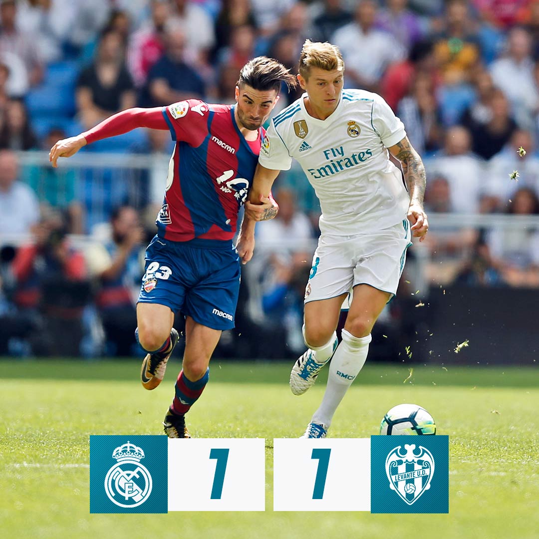 El Levante se encontraba relativamente cómodo ante un equipo el de Zidane que parecía desdibujado por el nuevo dibujo que había trazado el técnico. Pero el talento salió a relucir para que sobrepasado el ecuador del primer tiempo, Lucas empatase a la salida de un córner. Poco después se lesionaría muscularmente Benzema y daría entrada a un Bale que antes del descanso fallaría un mano a mano que disgustó y de lo lindo al Bernabéu.